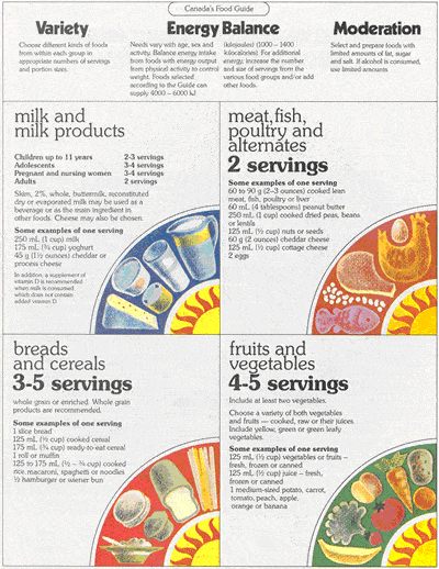 Reference: Nutrition Division, National Department of Health and Welfare (1961). Rules out – guide in. Canadian Nutrition Notes, 17(7):49-50 (cited in Health and Welfare Canada. Action towards healthy eating: technical report. 1990).