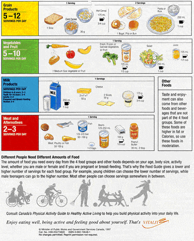 Introduction: Many people look to Canada’s Food Guide (CFG) as the ”measuring stick” as to whether they are eating a healthy diet, but did you know that over the years, CFG has changed dramatically? Canada’s first food guide, the Official Food Rules, was introduced to the public in July 1942. This guide acknowledged wartime food rationing, while endeavoring to prevent nutritional deficiencies and to improve the health of Canadians. Over the years the names of the food groups, the serving sizes and numbers of servings has changed. Serving sizes are now given in ranges; and one has to wonder if these changes have resulted in ”over-nutrition“.